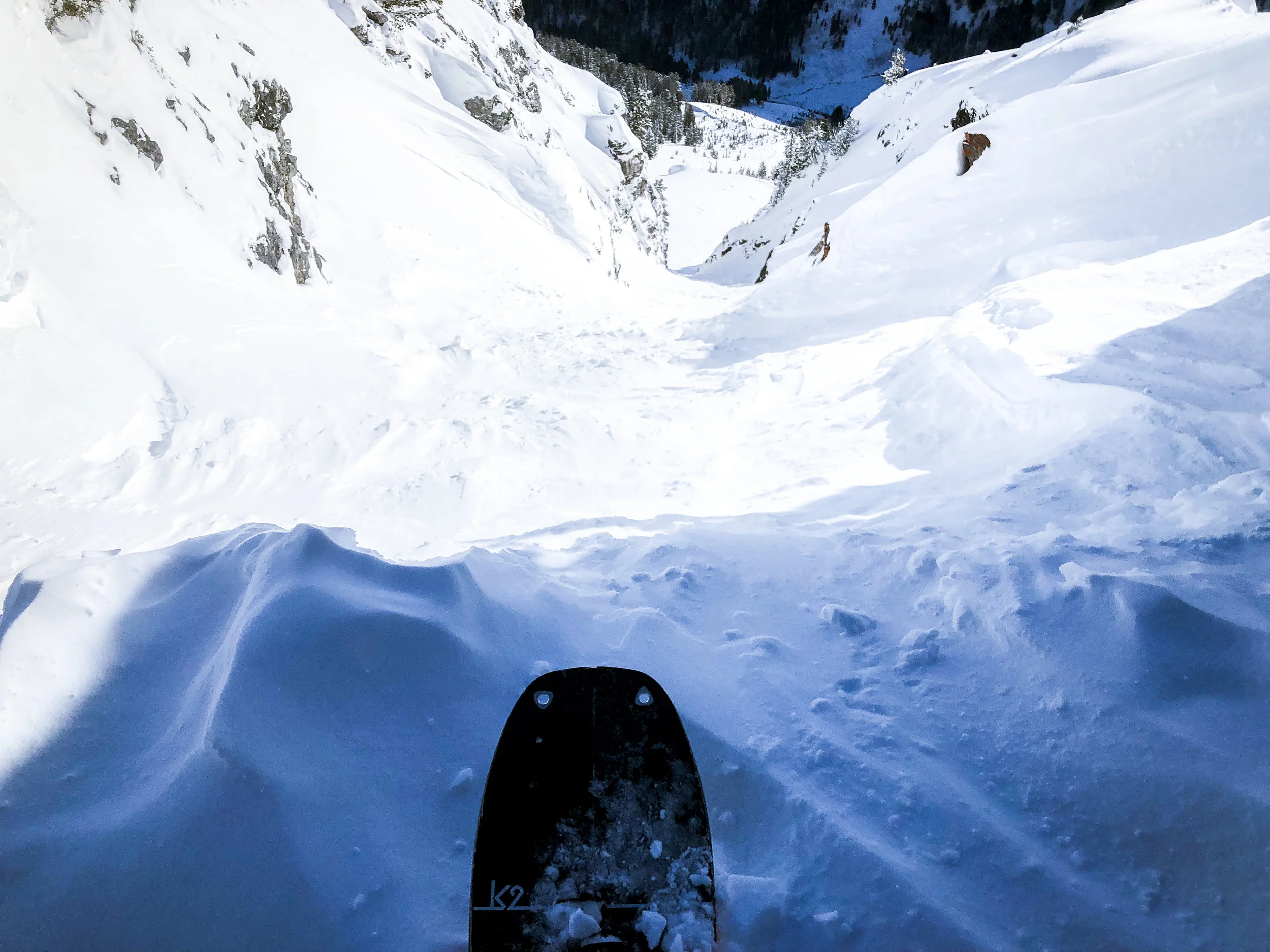 On the second run, we went over to God’s Lawnmower and began figuring things out. I’d never skied Gods, as Kevin and I were denied on our scouting mission in January. The entire headwall is slab, so when there’s hoar (there was), everything slides and exposes cliffs. This time, I brought a rope just in case, but we were granted clear passage and had a hell of a ride through the 50-degree steeps and tree-poppers below.